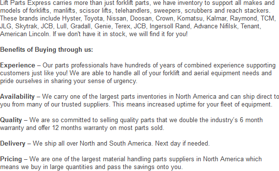For your entire fleet of lift-trucks, we offer the best deals on all our parts. Phone now to get an estimate on one of the attachments or parts we offer. We can be reached at: